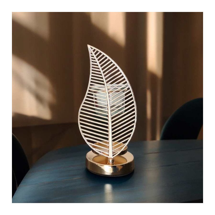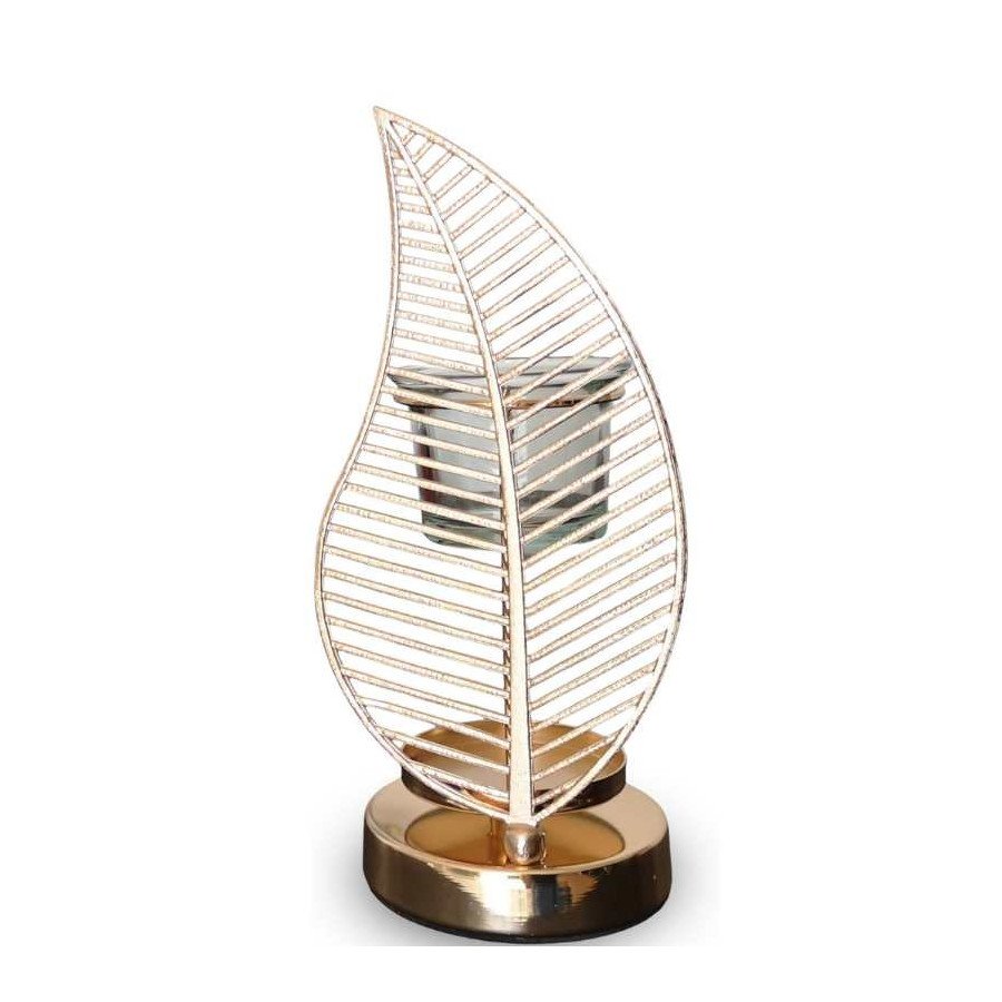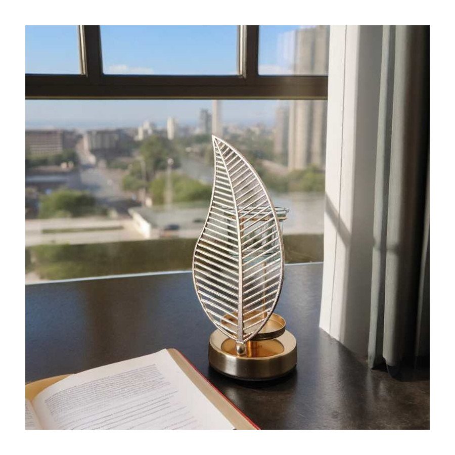 La feuille de palme, symbole de sérénité et d’équilibre, s’est imposée naturellement. Entièrement réalisé en métal, son design élancé, sa teinte dorée et ses lignes symétriques font de ce brûleur de parfum un objet de décoration au charme intemporel.