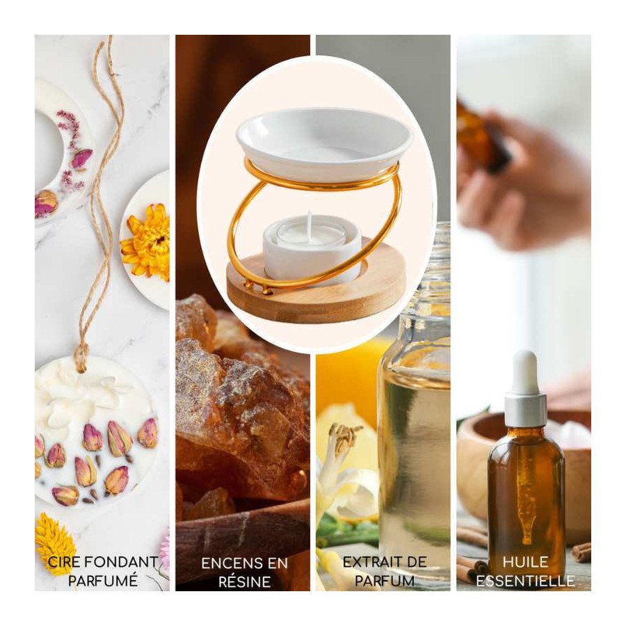Pour diffuser vos senteurs, le brûle parfum peut accueillir dans sa coupole en céramique résistante à la chaleur une cire fondante parfumée, quelques gouttes d'huile essentielle, un extrait de parfum ou de l'encens en résine.