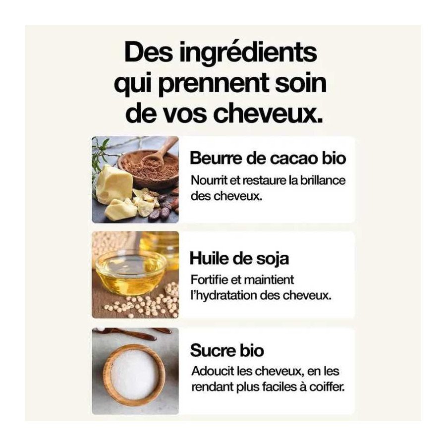 Eau - Beurre de cacao Bio : Nourrit et restaure la brillance des cheveux - Huile de soja : Fortifie les fibres capillaires - Caprylic/Capric Triglyceride : Endigue la perte d’hydratation - Sucre Bio : Aide à hydrater et adoucir les cheveux, en les rendant plus doux et plus faciles à coiffer - Cire de palmier de Carnauba Bio : Possède des propriétés épaississantes et fixantes, idéales pour donner du volume et de la tenue aux cheveux - Sodium Polyitaconate : Permet aux cheveux de sécher plus rapidement, protégeant ainsi les cheveux de la chaleur prolongée d’un brushing ou du coiffage - Glyceryl Stearate SE : Élimine l’électricité statistique - VP/VA Copolymer : Agent fixant formant un film sur les cheveux - Diatomite : Absorbe l’excès de sébum - Lauryl Glucoside : Hydrate et apaise le cuir chevelu - Huile essentielle de menthe Bio : Séborégulatrice - Sodium Benzoate : Conservateur - Vitamine E : Protège la fibre capillaire des agressions extérieures - Huile de tournesol : Aide à maintenir l'hydratation naturelle des cheveux - Dehydroacetic Acid : Conservateur - Benzyl Alcohol : Conservateur - Limonene : Ingrédient aromatique naturellement présent dans le parfum naturel - Linalool : Ingrédient aromatique naturellement présent dans le parfum naturel.