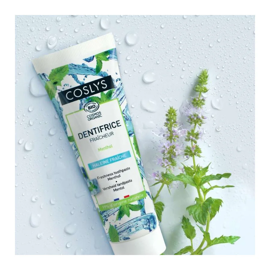 Végan et Cruelty Free, le dentifrice fraîcheur Coslys est composée à 99% d'ingrédients d’origine naturelle, ne contient ni fluor ni dioxyde de titane.