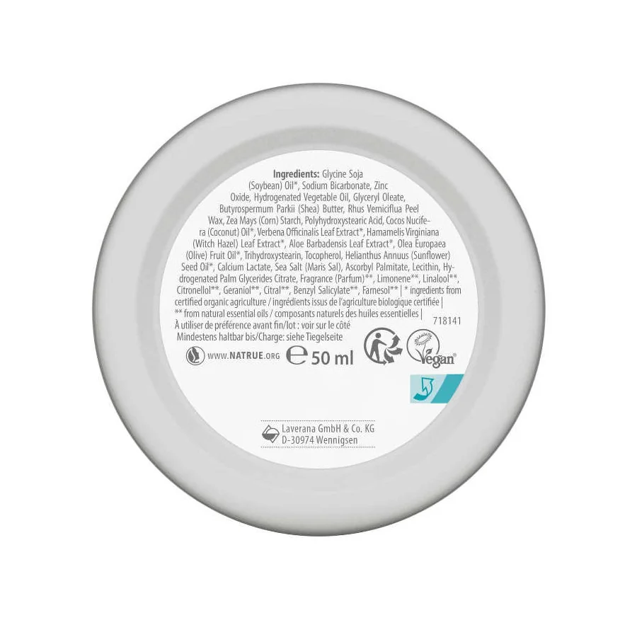 INCI : Glycine Soja (Soybean) Oil*, Sodium Bicarbonate, Zinc Oxide, Hydrogenated Vegetable Oil, Glyceryl Oleate, Butyrospermum Parkii (Shea) Butter, Rhus Verniciflua Peel Wax, Zea Mays (Corn) Starch, Polyhydroxystearic Acid, Cocos Nucifera (Coconut) Oil*, Verbena Officinalis Leaf Extract*, Hamamelis Virginiana (Witch Hazel) Leaf Extract*, Aloe Barbadensis Leaf Extract*, Olea Europaea (Olive) Fruit Oil*, Trihydroxystearin, Tocopherol, Helianthus Annuus (Sunflower) Seed Oil*, Calcium Lactate, Sea Salt (Maris Sal), Ascorbyl Palmitate, Lecithin, Hydrogenated Palm Glycerides Citrate, Fragrance (Parfum)**, Limonene**, Linalool**, Citronellol**, Geraniol**, Citral**, Benzyl Salicylate**, Farnesol**.