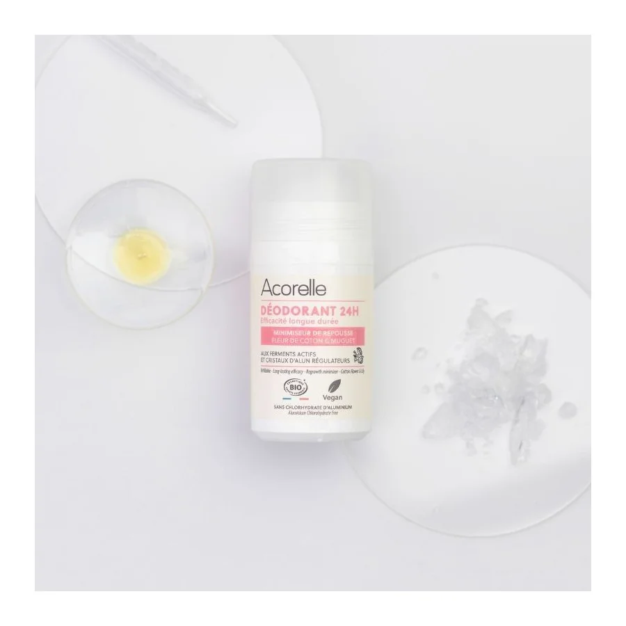 Le déodorant anti-repousse Acorelle associe habilement deux ingrédients naturels pour assurer un confort optimal tout au long de la journée : les Cristaux d’Alun régulent la transpiration, tandis que les Ferments actifs agissent sur les bactéries, les transformant en une forme inodore, tout en préservant l'équilibre du microbiote cutané.