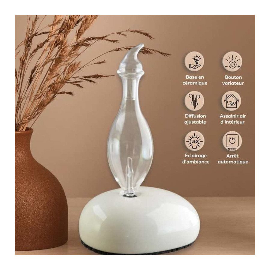 Il est composé d'une base en céramique blanche et d'une verrerie artisanale. La verrerie est éclairée par une LED bleue pour donner une touche décorative supplémentaire.