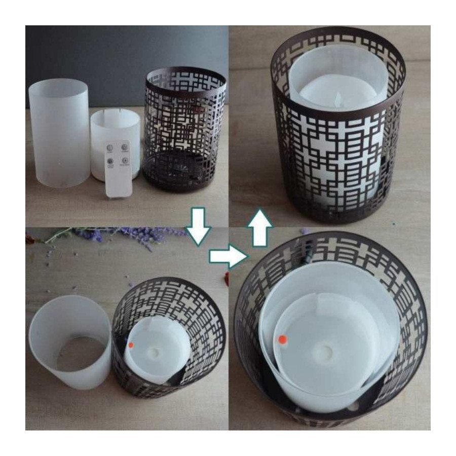 Son design singulier réalisé en fer forgé donne une l’illusion d’une bougie placée dans un photophore ajouré. Un astucieux système aimanté permet de maintenir le diffuseur au centre du photophore tout en assurant l’alimentation électrique.