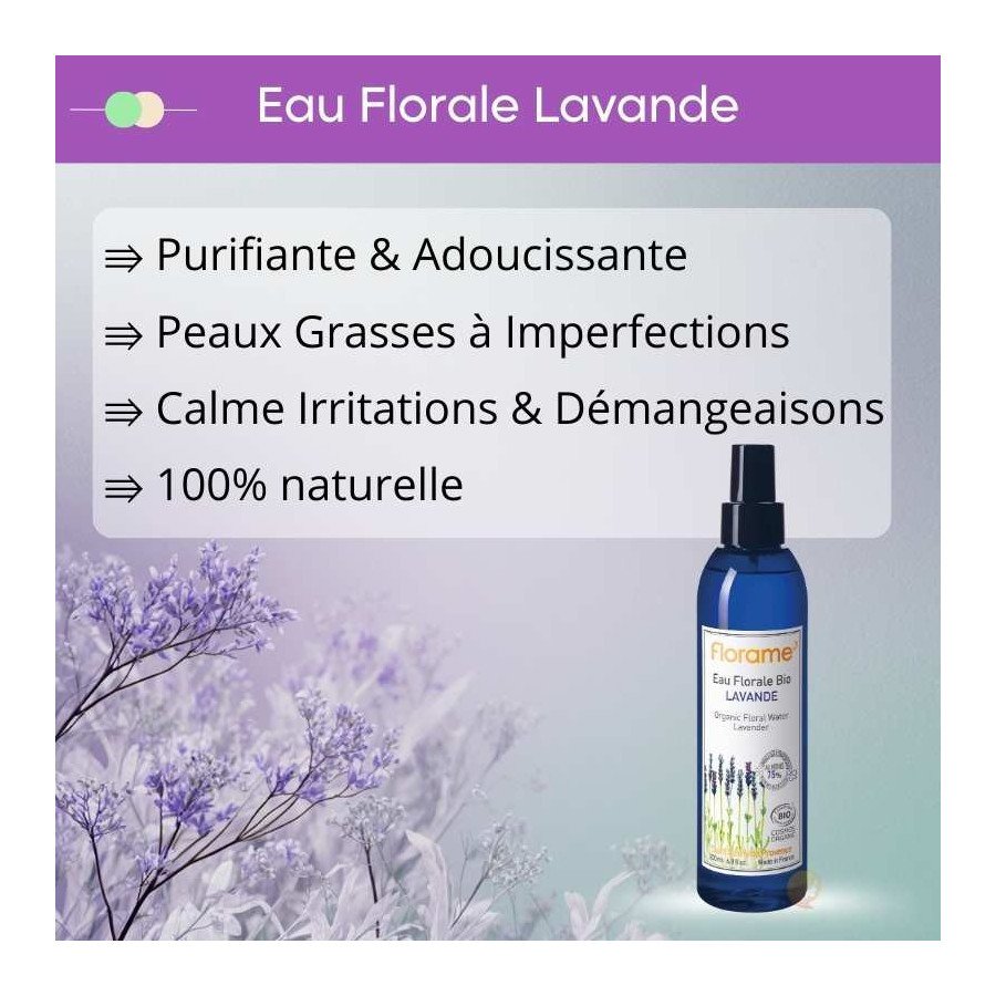 Utilisée comme lotion nettoyante, l'Eau Florale de Lavande Bio Florame (aussi appelée eau de lavande ou hydrolat de lavande) purifie et adoucit les peaux mixtes, grasses, acnéique et à imperfections.