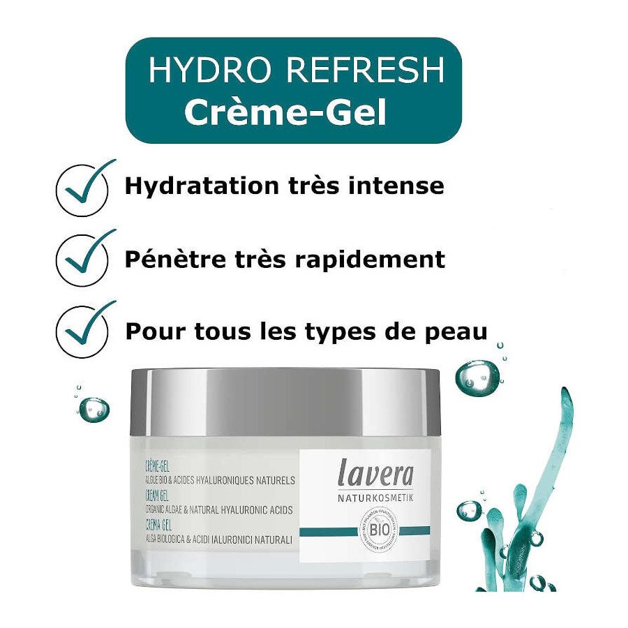 Le Gel-Crème Hydratant Lavera Hydro-Refresh offre une expérience désaltérante unique et inédite ! Formulé naturellement à base d'algues marines bio et d'acide hyaluronique naturel, ce soin jour ultra-léger activateur d'hydratation, revitalise, hydrate intensément et tonifie la peau pour une vive sensation de fraîcheur instantanée et une efficacité maximum.