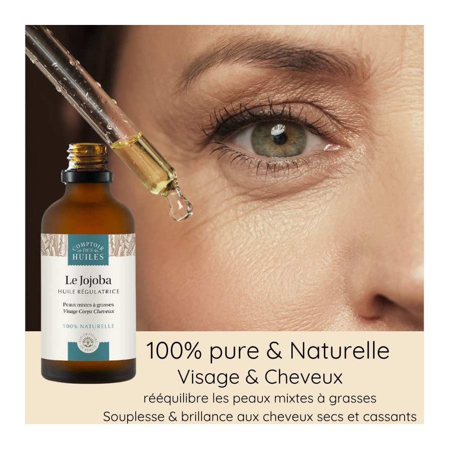 Pour le visage, quelques goutes suffisent ! L'huile de jojoba Comptoir des Huiles peut venir en remplacement de votre crème de nuit ou de jour, surtout si vous avez la peau grasse.
