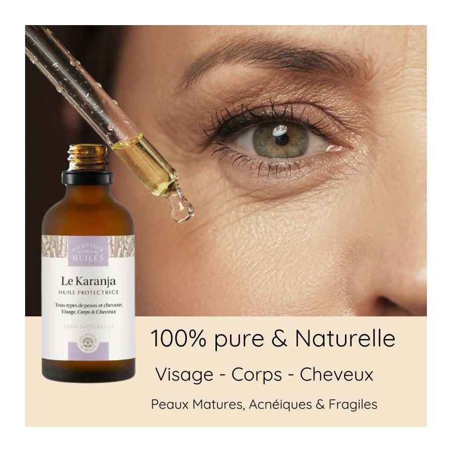 A la fois précieuse et polyvalente, l'huile de karanja est réputé pour ses propriétés anti-âge, antimicrobiennes et anti-inflammatoires. Elle sera donc efficace pour réduire l'apparence des signes de l'âge des peaux matures qui se manifestent par les rides et les sillons ainsi que pour apaiser les affections cutanées comme l'acné des peaux grasses et acnéiques.