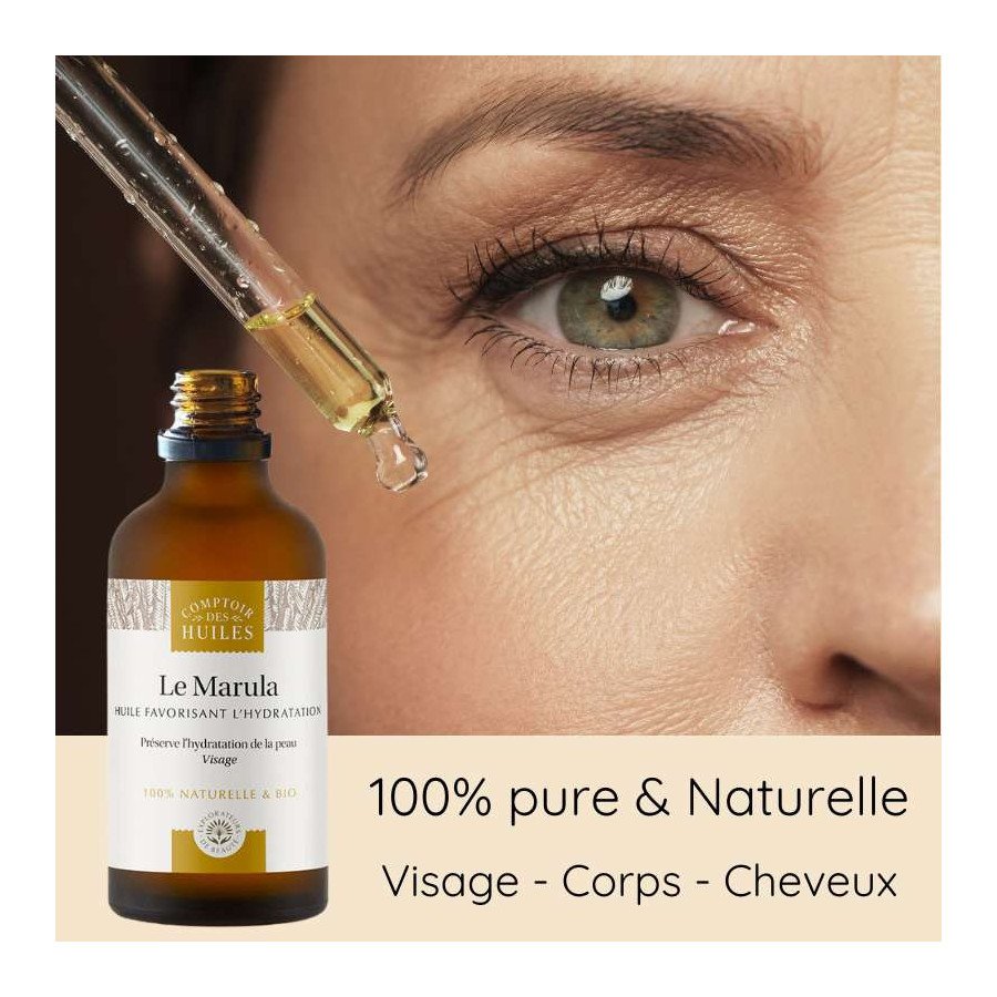 Appréciée pour ses propriétés hydratantes, nourrissantes, et réparatrices, l'Huile de Marula Biologique Comptoir des Huiles est une huile sèche polyvalente adaptée à tous les types de peaux, en soin visage ou huile de massage pour le corps et des cheveux.