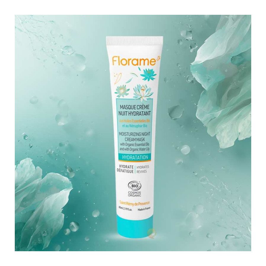 Pour les peaux déshydratées et désaltérées en manque d'hydratation, le masque crème nuit Florame offre un bain hydratant haute performance à la peau. Enrichie en acide hyaluronique, d'un extrait de fleur Nénuphar Bio et d'une synergie d'huiles essentielles biologiques, elle participe à préserver la peau des agressions extérieures et de la pollution à l'origine du vieillissement cutané.
