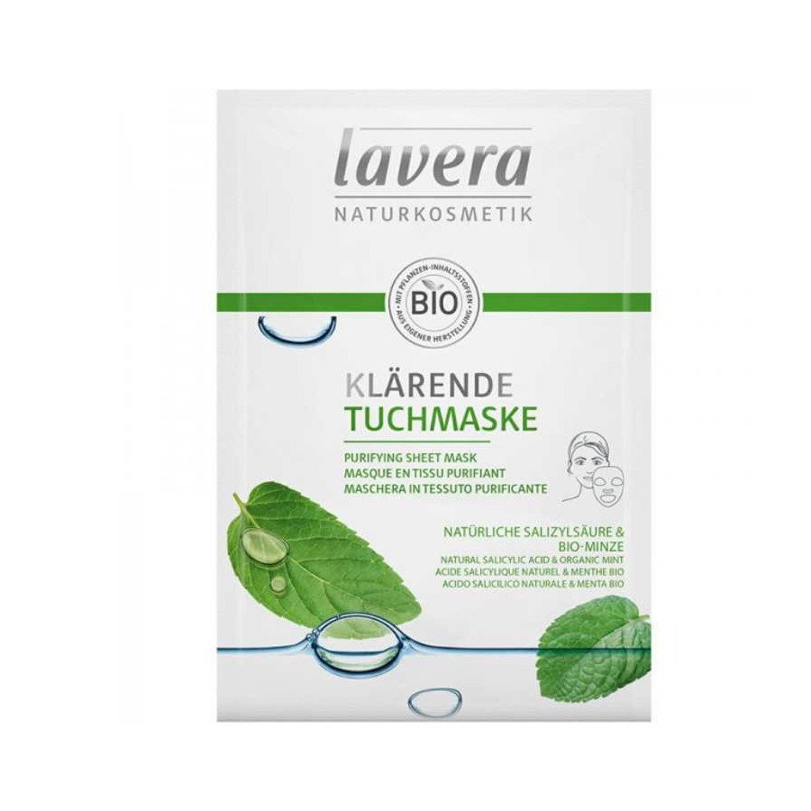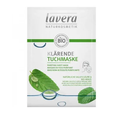 Le masque tissu purifiant Lavera réduit l’apparence des imperfections, absorbe l’excès de sébum et resserre les pores grâce aux extraits végétaux de menthe poivrée et à l'action de l'acide salicylique qui offre un effet "peeling".