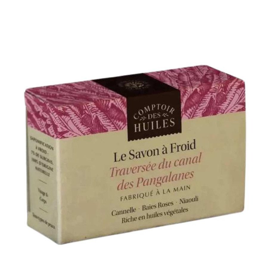Fabriqué en France et à la main par saponification à froid avec les huiles essentielles de Cannelle, Niaouli et Baie Rose, le Savon Traversée du canal des Pangalanes Comptoir des Huiles, apporte durablement douceur et hydratation à tous les types de peau.