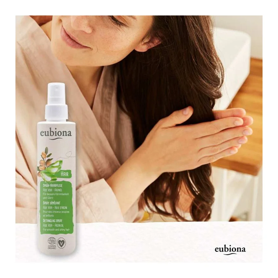 Enrichi en Aloé Vera et en Huile d'Argan, le Spray Démêlant Eubiona hydrate, nourrit et faciliter le coiffage des cheveux tout en revitalisant et protégeant la chevelure au quotidien.